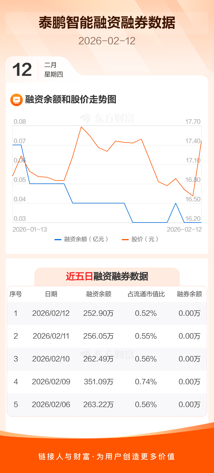 交易所最新数据显示,泰鹏智能于2026年2月12日获融资买入47.37万元,融资偿还50.52万元,当日融资净偿还3.15万元。目前,该股融资余额252.90万,占流通市值比例为0.52%。