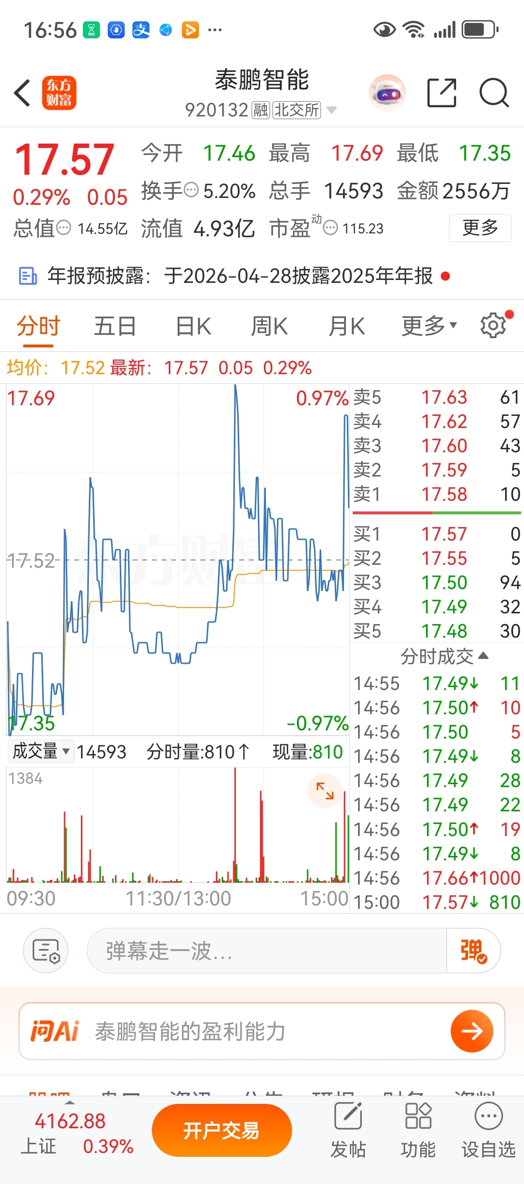 $泰鹏智能(SZ920132)$ 很明显近几天主力一直在吸筹码,今天几次出现了万手买单在买一位置,今天主力四次拉升至少买了七十万股,主力在寻找合力的主力一起做多,大家一起赚钱,大家别砸了