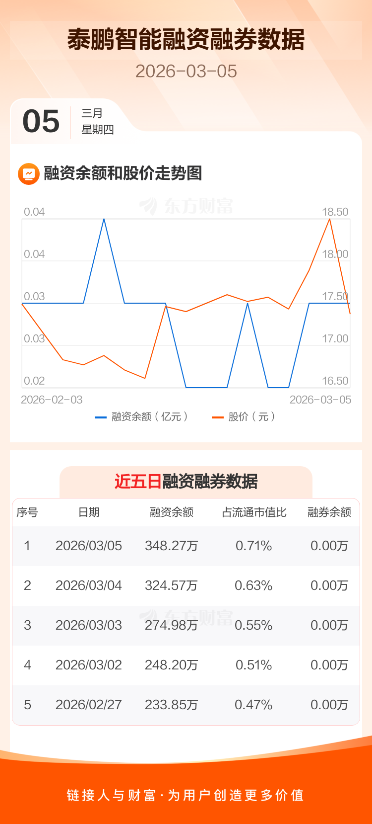 交易所最新数据显示,泰鹏智能于2026年3月5日获融资买入255.75万元,融资偿还232.06万元,当日融资净买入23.7万元。目前,该股融资余额348.27万,占流通市值比例为0.71%。