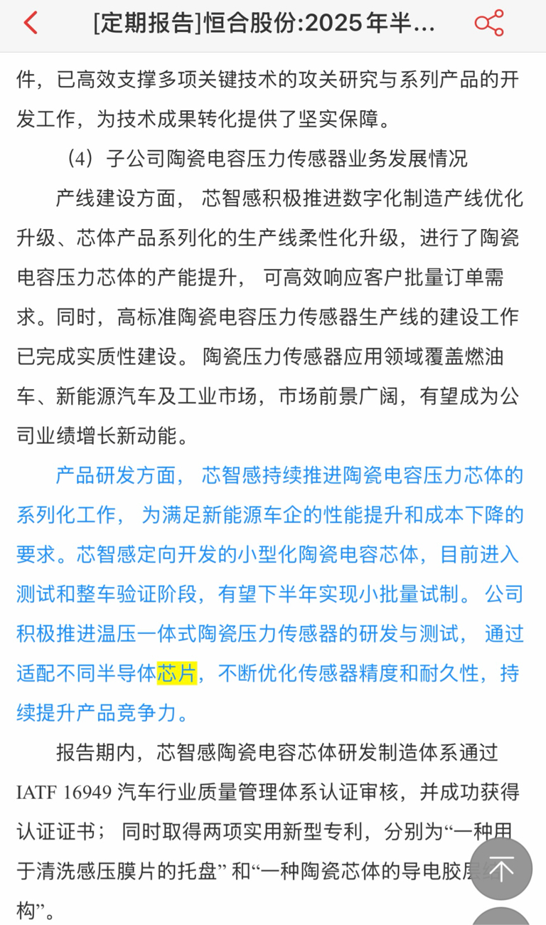 产品研发方面, 芯智感持续推进陶瓷电容压力芯体的系列化工作, 为满足新能源车企的性能提升和成本下降的要求。芯智感定向开发的小型化陶瓷电容芯体,目前进入测试和整车验证阶段,有望下半年实现小批量试制。 公司积极推进温压一体式陶瓷压力传感器的研发与测试, 通过适配
