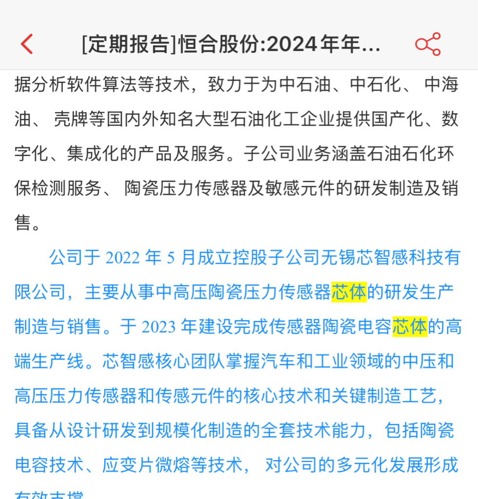 产线建设方面, 芯智感积极推进数字化制造产线优化升级、芯体产品系列化的生产线柔性化升级,进行了陶瓷电容压力芯体的产能提升, 可高效响应客户批量订单需求。同时,高标准陶瓷电容压力传感器生产线的建设工作已完成实质性建设。 陶瓷压力传感器应用领域覆盖燃油车、新能源汽车及工业市场,市场前景广阔,有望成为公司业绩增长新动能。