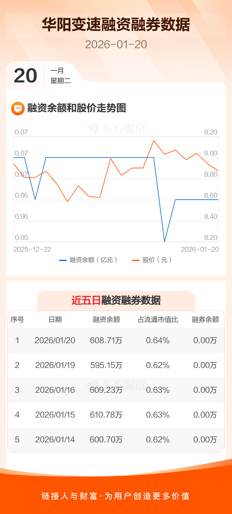 交易所最新数据显示,华阳变速于2026年1月20日获融资买入29.23万元,融资偿还15.67万元,当日融资净买入13.57万元。目前,该股融资余额608.71万,占流通市值比例为0.64%。