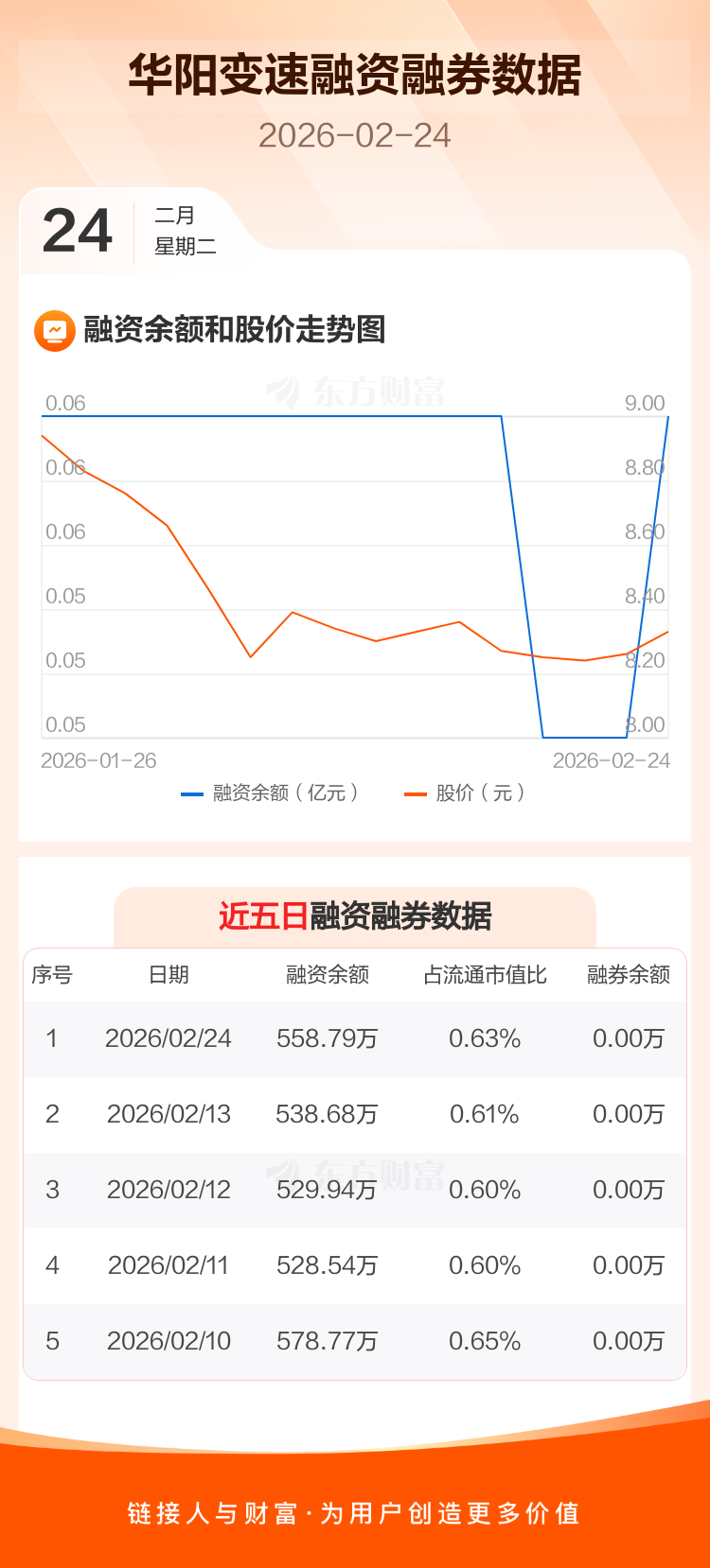 交易所最新数据显示,华阳变速于2026年2月24日获融资买入37.76万元,融资偿还17.65万元,当日融资净买入20.11万元。目前,该股融资余额558.79万,占流通市值比例为0.63%。