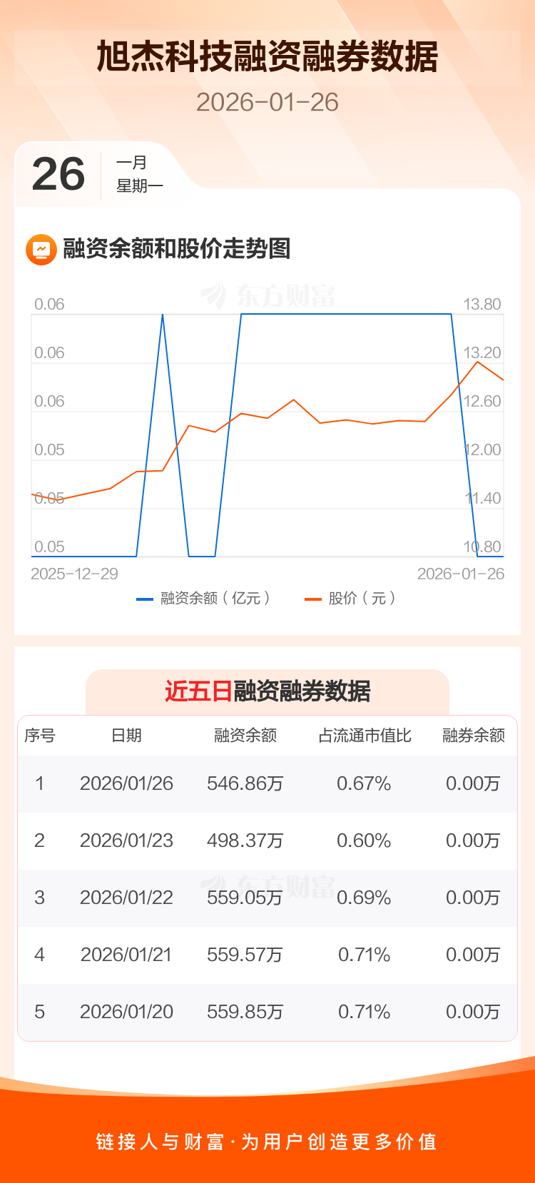 交易所最新数据显示,旭杰科技于2026年1月26日获融资买入85.99万元,融资偿还37.50万元,当日融资净买入48.49万元。目前,该股融资余额546.86万,占流通市值比例为0.67%。