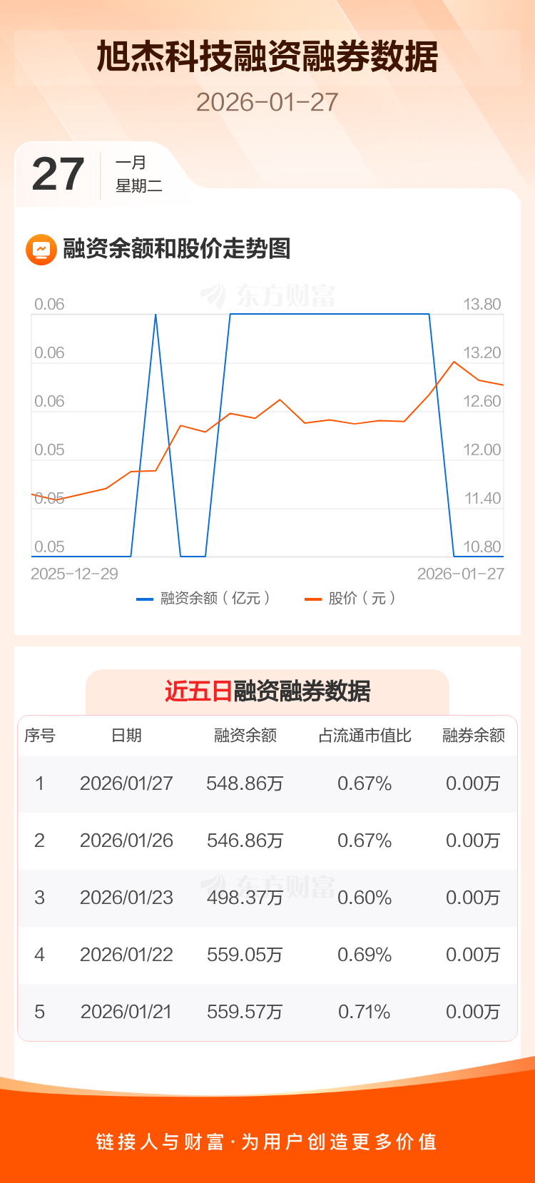 交易所最新数据显示,旭杰科技于2026年1月27日获融资买入4.95万元,融资偿还2.95万元,当日融资净买入2万元。目前,该股融资余额548.86万,占流通市值比例为0.67%。