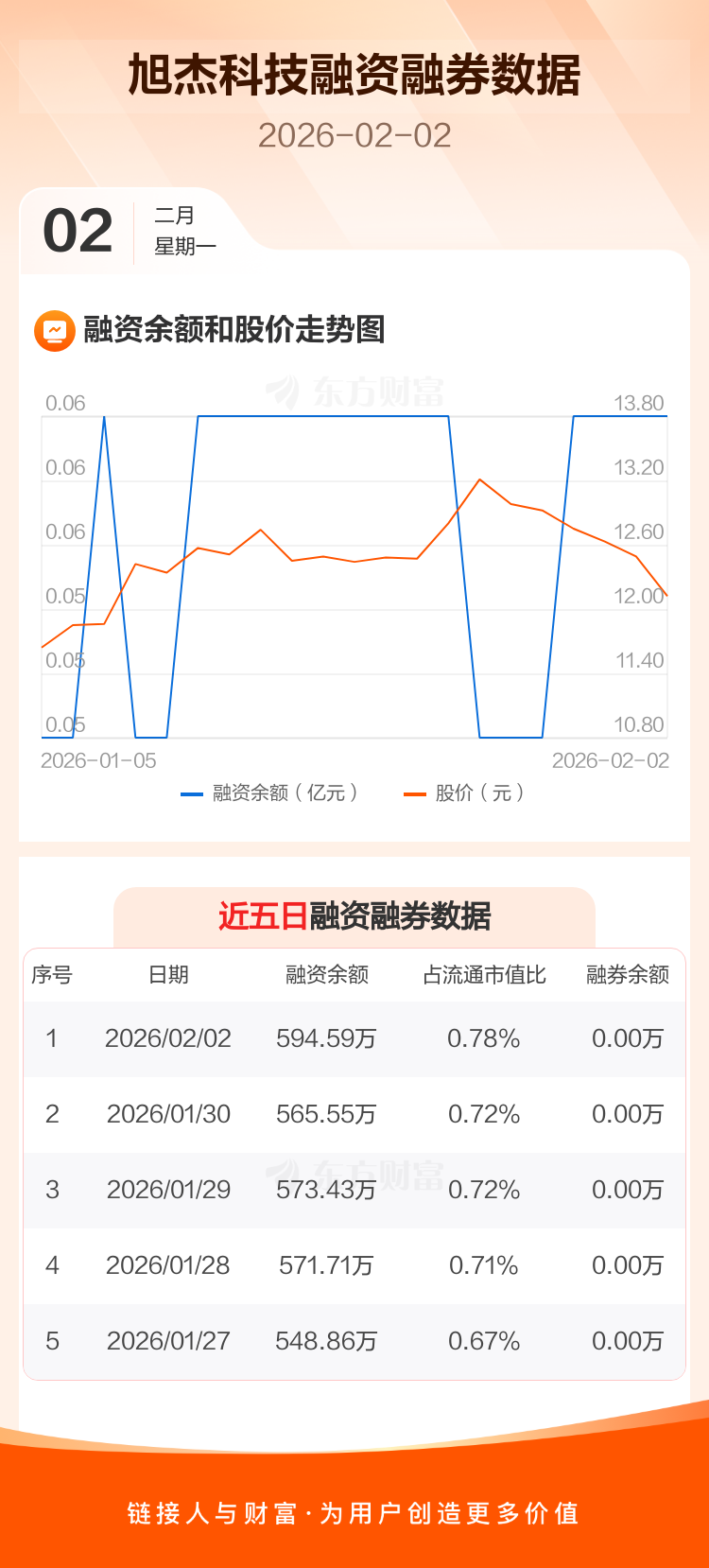 交易所最新数据显示,旭杰科技于2026年2月2日获融资买入76.61万元,融资偿还47.58万元,当日融资净买入29.04万元。目前,该股融资余额594.59万,占流通市值比例为0.78%。