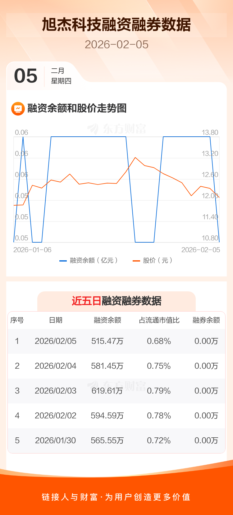 交易所最新数据显示,旭杰科技于2026年2月5日获融资买入26.81万元,融资偿还92.79万元,当日融资净偿还65.98万元。目前,该股融资余额515.47万,占流通市值比例为0.68%。