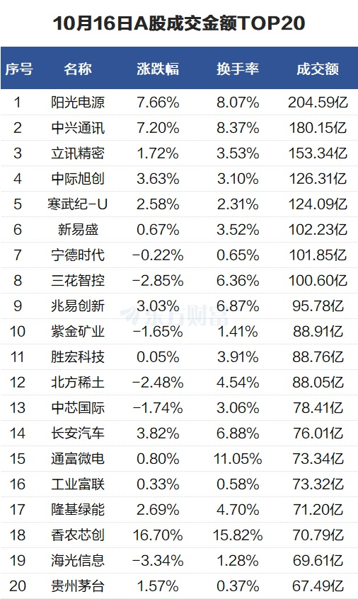 活跃个股:阳光电源成交205亿元 N长江换手率68%