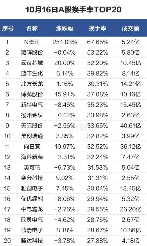 当天换手率最高的个股为N长江,全天换手率67.65%。矩阵股份紧随其后,全天换手率53.22%。