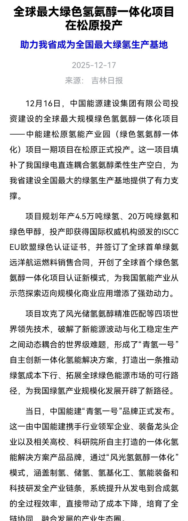 全球最大绿氢氨醇一体项目投产,加速绿氢项目布局!