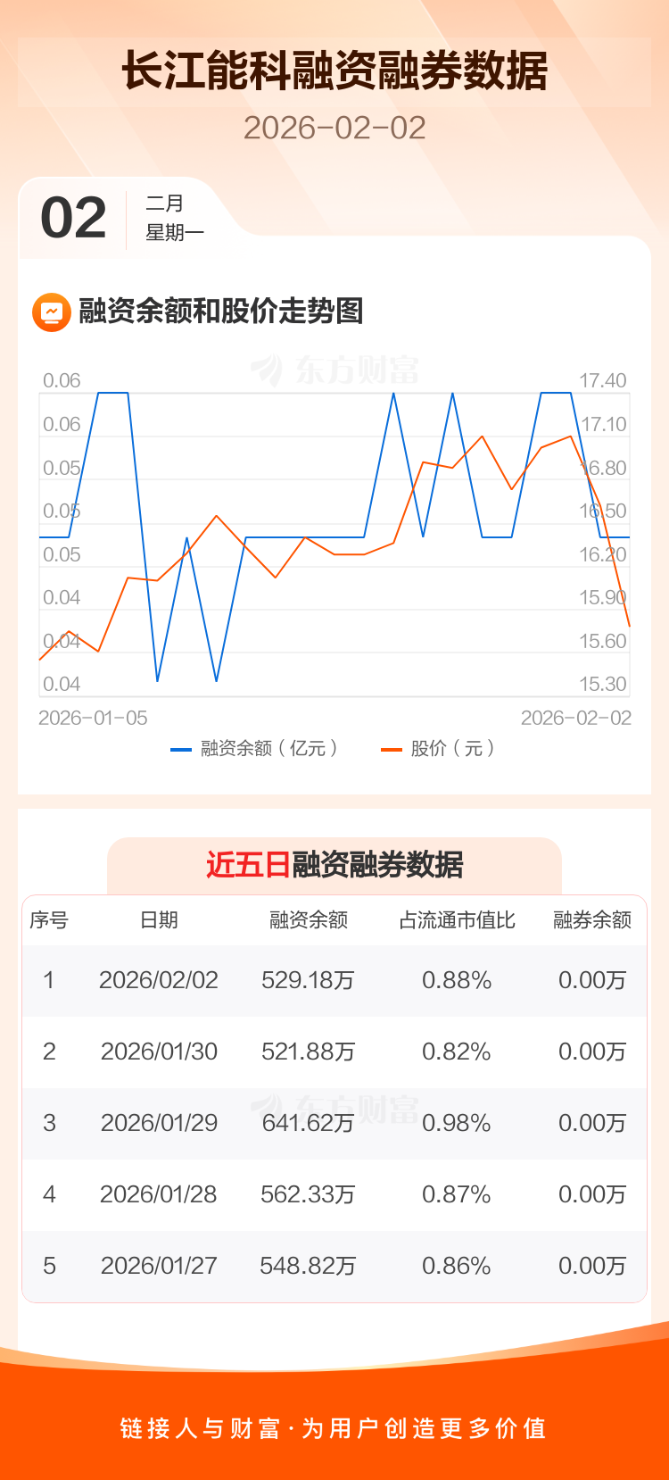 交易所最新数据显示,长江能科于2026年2月2日获融资买入57.46万元,融资偿还50.16万元,当日融资净买入7.29万元。目前,该股融资余额529.18万,占流通市值比例为0.88%。