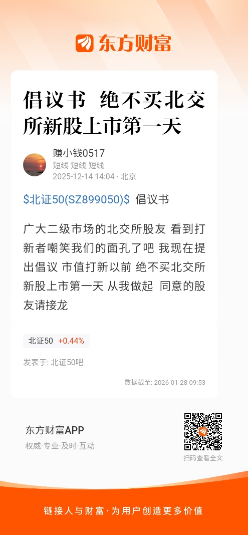 广大二级市场的北交所股友 看到打新者嘲笑我们的面孔了吧 我现在提出倡议 市值打新以前 绝不买北交所新股上市第一天 从我做起 同意的股友请接龙
