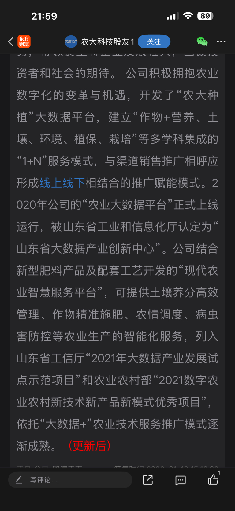 $农大科技(SZ920159)$ 农大科技董秘回复: 有被认定的大数据平台+智慧农业!