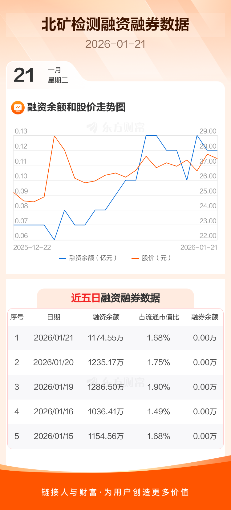 交易所最新数据显示,北矿检测于2026年1月21日获融资买入173.98万元,融资偿还234.60万元,当日融资净偿还60.62万元。目前,该股融资余额1174.55万,占流通市值比例为1.68%。