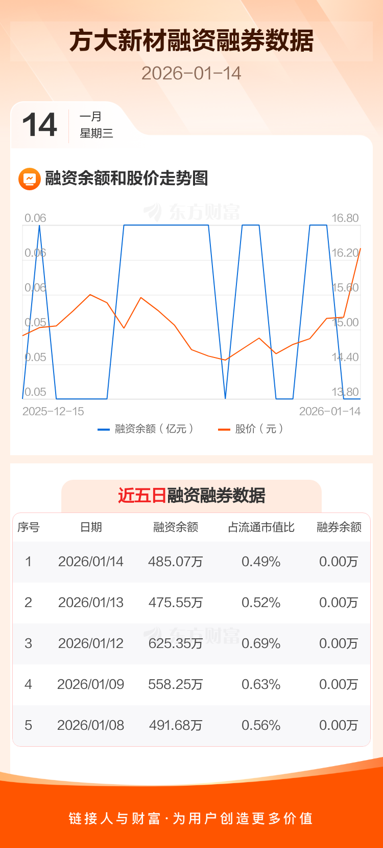交易所最新数据显示,方大新材于2026年1月14日获融资买入77.03万元,融资偿还67.50万元,当日融资净买入9.52万元。目前,该股融资余额485.07万,占流通市值比例为0.49%。