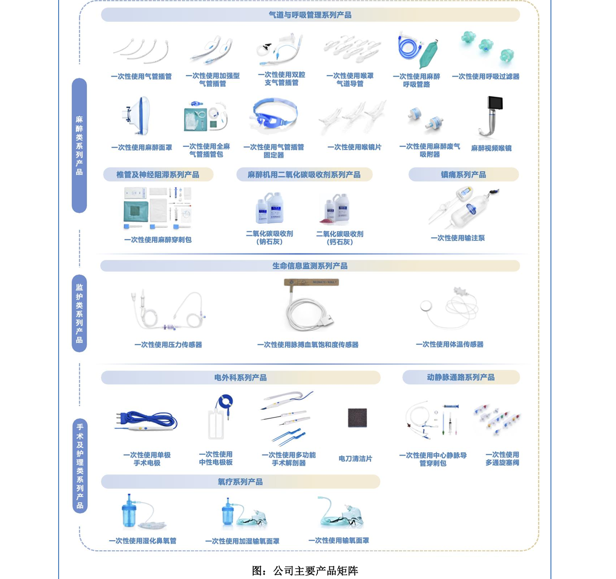 公司是面向全球的麻醉、监护类医疗器械综合产品提供商,主营业务为麻醉、监护类医疗器械产品的研发、生产和销售,产品已广泛应用于麻醉科、ICU病房、急诊科等科室的终端临床需求。公司自成立以来,持续深耕麻醉和监护医用耗材的研发和制造,是我国较早从事麻醉和监护类医用耗材研发制造的科技型医疗器械生产企业之一,也是该细分领域的头部企业。