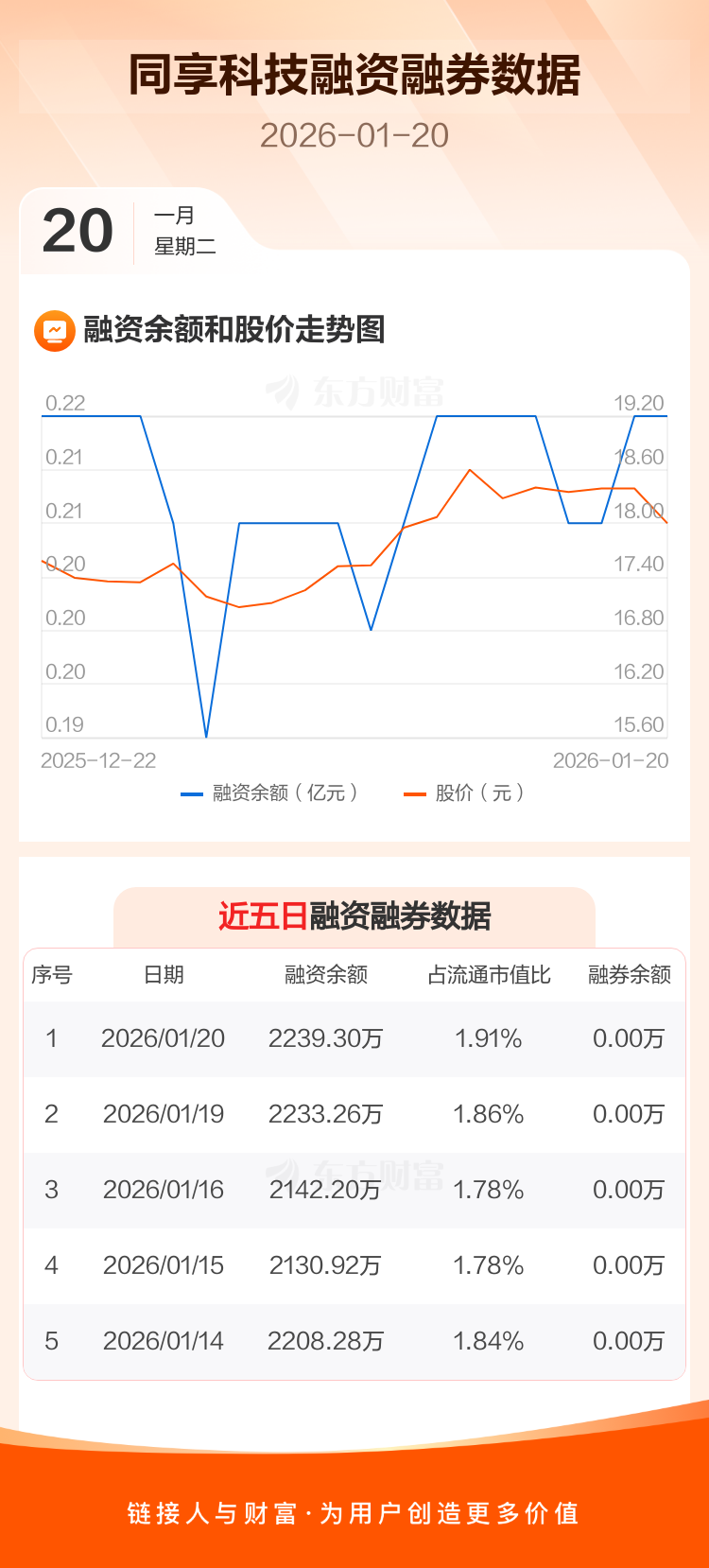 交易所最新数据显示,同享科技于2026年1月20日获融资买入99.66万元,融资偿还93.62万元,当日融资净买入6.04万元。目前,该股融资余额2239.30万,占流通市值比例为1.91%。