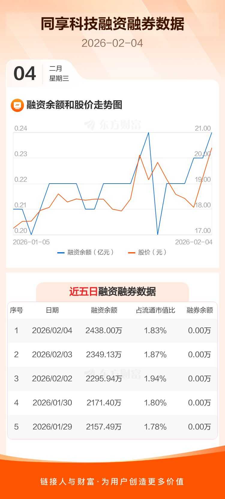 交易所最新数据显示,同享科技于2026年2月4日获融资买入429.47万元,融资偿还340.60万元,当日融资净买入88.87万元。目前,该股融资余额2438.00万,占流通市值比例为1.83%。