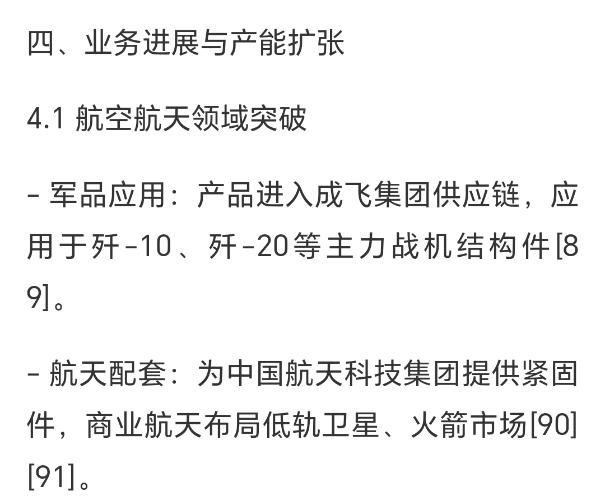 - 军品应用:产品进入成飞集团供应链,应用于歼-10、歼-20等主力战机结构件[89]。