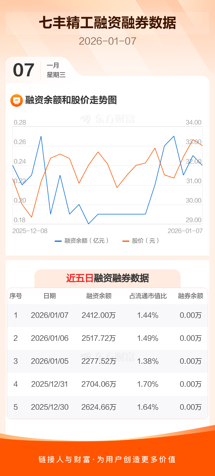 交易所最新数据显示,七丰精工于2026年1月7日获融资买入742.36万元,融资偿还848.09万元,当日融资净偿还105.73万元。目前,该股融资余额2412.00万,占流通市值比例为1.44%。