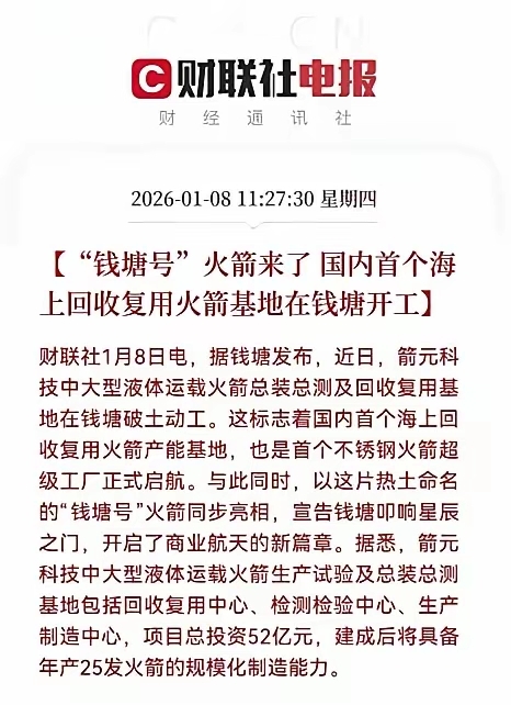$七丰精工(SZ920169)$ 商业航天又迎来大利好了。今天刷到个大新闻,箭元科技在钱塘砸了52亿建的中大型液体运载火箭基地破土了。这可不是普通工厂——国内首个海上回收复用火箭产能基地,全球都少见的不锈钢火箭超级工厂!和基地一起亮相的"钱塘号",直接把钱塘推上了商业航天新起点。