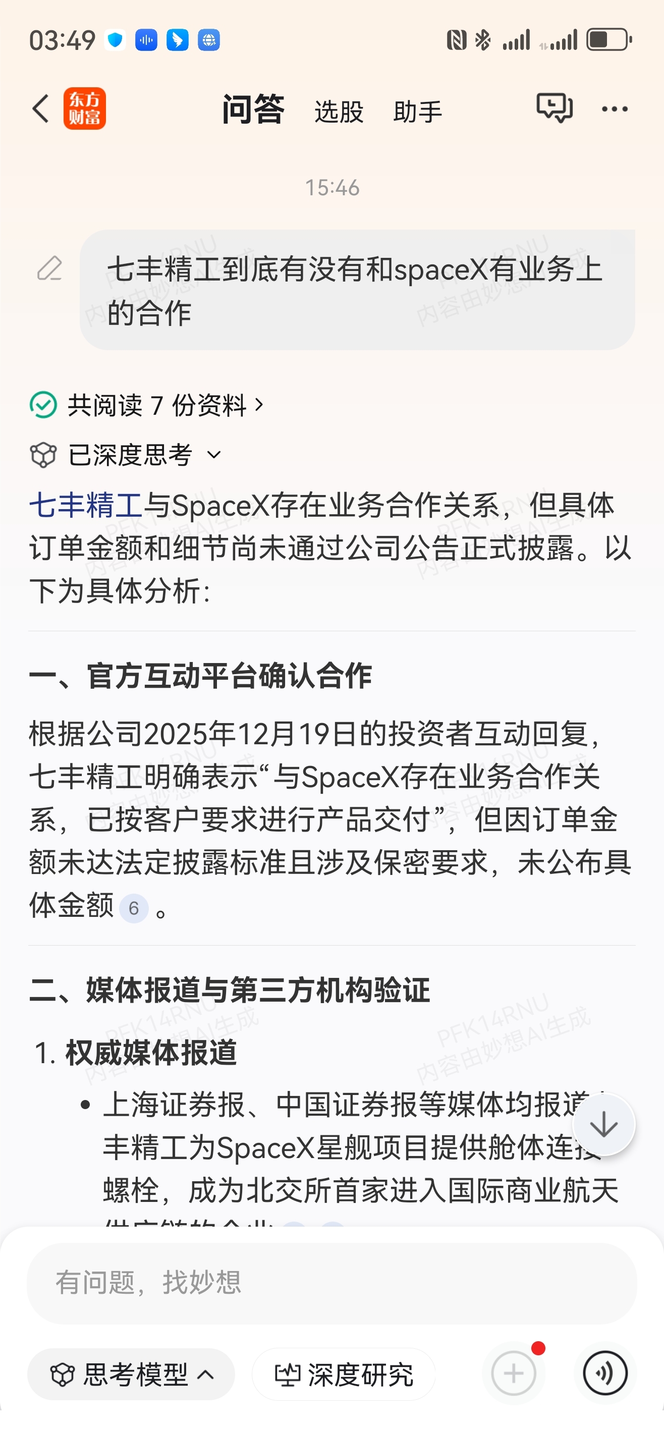 哪些不研究不学习的人整天怀疑七丰精工是否供货给SpaceX,难道这有假吗?坚定持