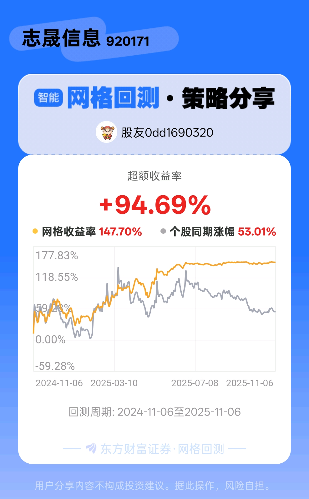 #条件单交流# #网格交易晒单#我使用网格交易回测了最关心的个股,朋友们走过路过看看我的收益~$志晟信息(SZ920171)$