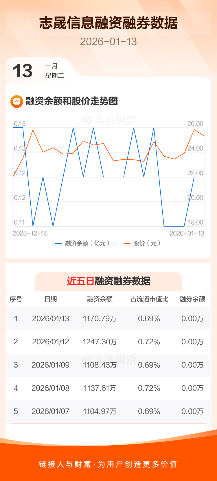交易所最新数据显示,志晟信息于2026年1月13日获融资买入380.00万元,融资偿还456.51万元,当日融资净偿还76.51万元。目前,该股融资余额1170.79万,占流通市值比例为0.69%。