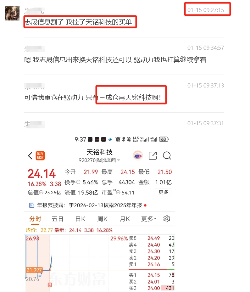 2、出来的三成仓9:25直接挂高买$天铭科技(SZ920270)$ 开盘无悬念,直接冲15%,成本不到6%~