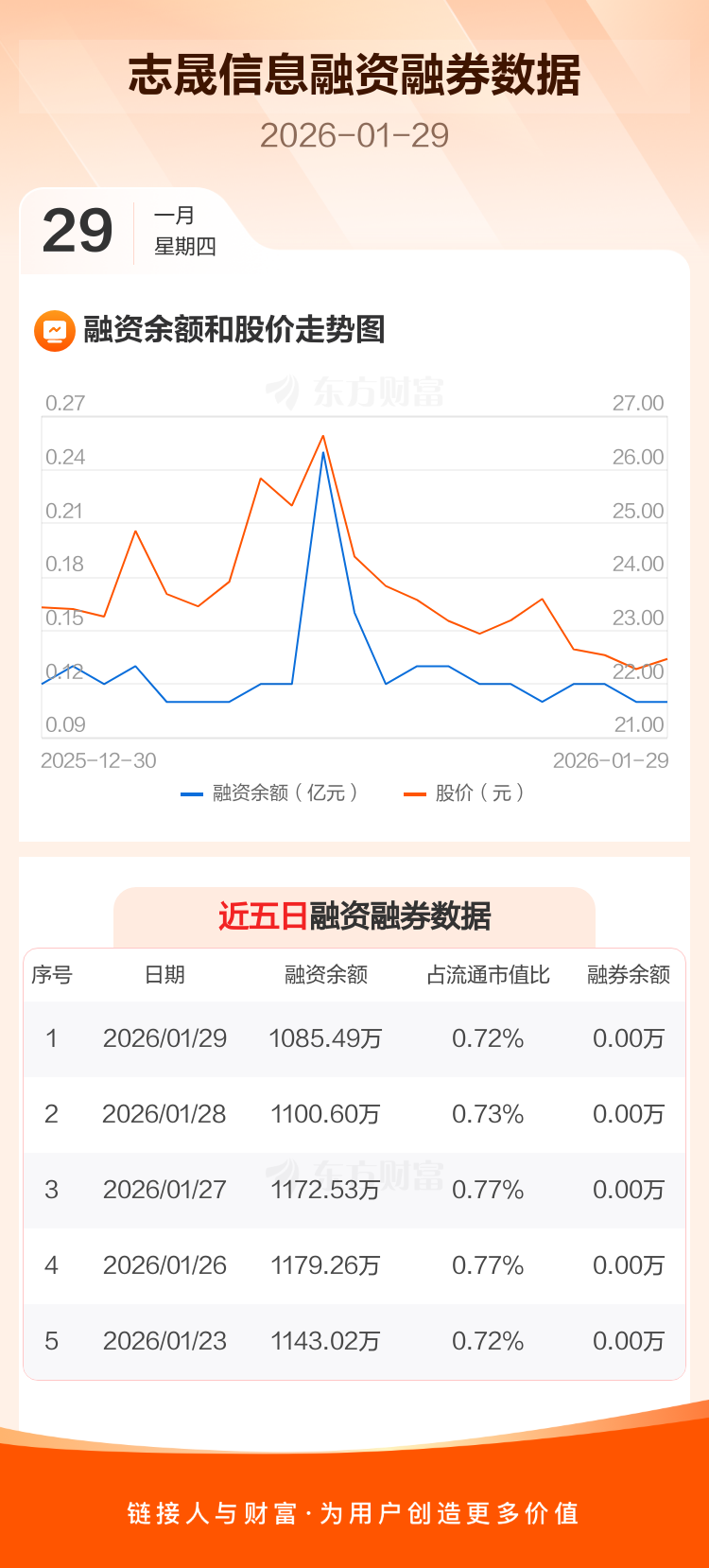 交易所最新数据显示,志晟信息于2026年1月29日获融资买入20.74万元,融资偿还35.84万元,当日融资净偿还15.11万元。目前,该股融资余额1085.49万,占流通市值比例为0.72%。