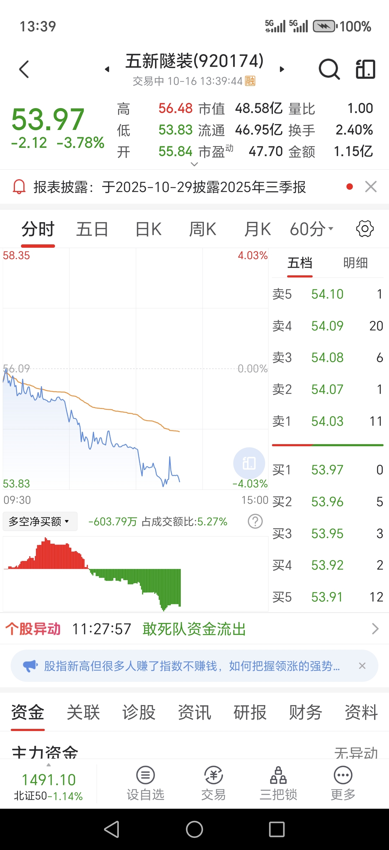 $五新隧装(SZ920174)$ 资金流出