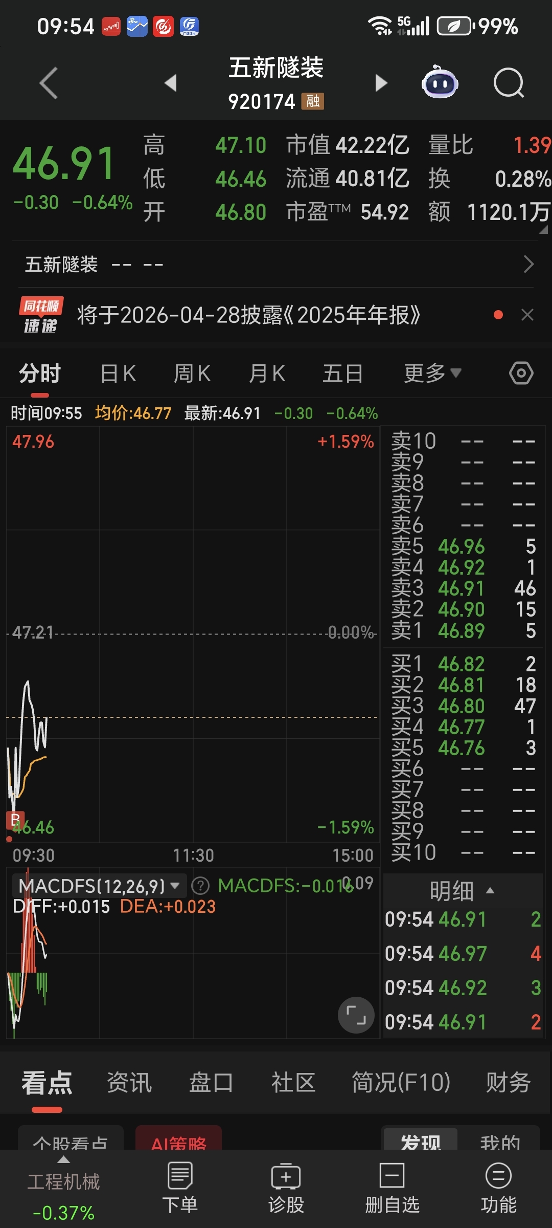$五新隧装(SZ920174)$ 46.46今天我最低,你们不要跟我比