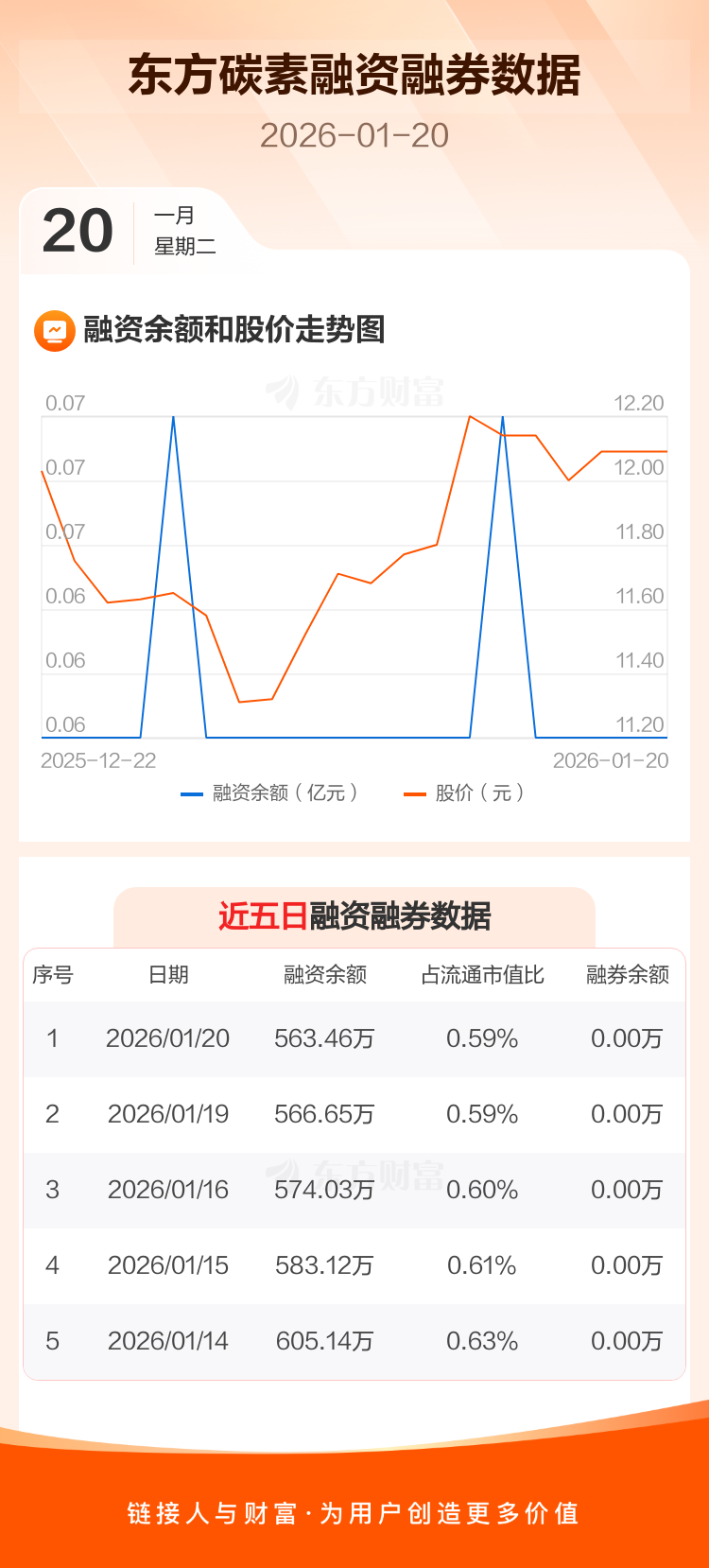 交易所最新数据显示,东方碳素于2026年1月20日获融资买入8.05万元,融资偿还11.24万元,当日融资净偿还3.19万元。目前,该股融资余额563.46万,占流通市值比例为0.59%。
