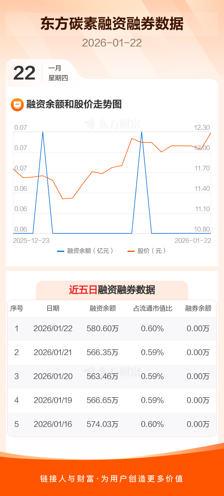 交易所最新数据显示,东方碳素于2026年1月22日获融资买入24.97万元,融资偿还10.72万元,当日融资净买入14.25万元。目前,该股融资余额580.60万,占流通市值比例为0.60%。