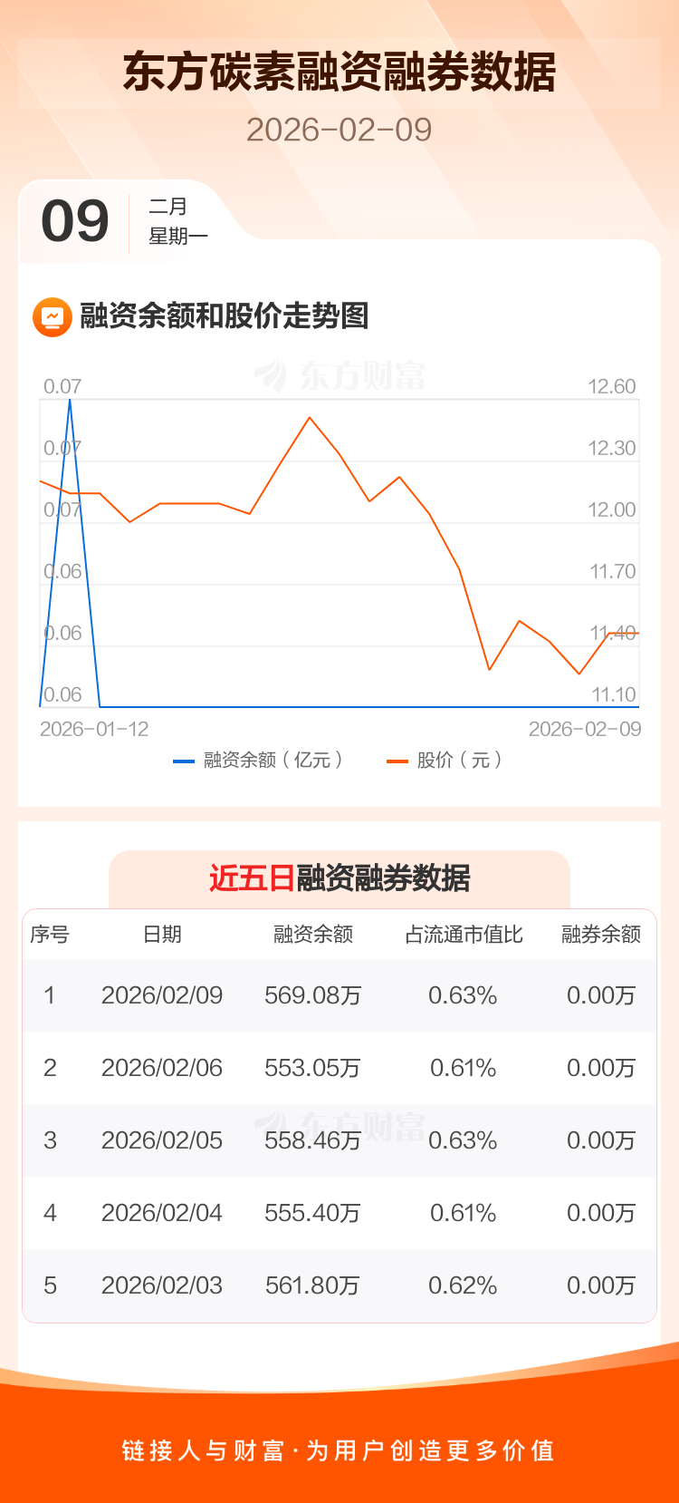 交易所最新数据显示,东方碳素于2026年2月9日获融资买入18.40万元,融资偿还2.37万元,当日融资净买入16.04万元。目前,该股融资余额569.08万,占流通市值比例为0.63%。