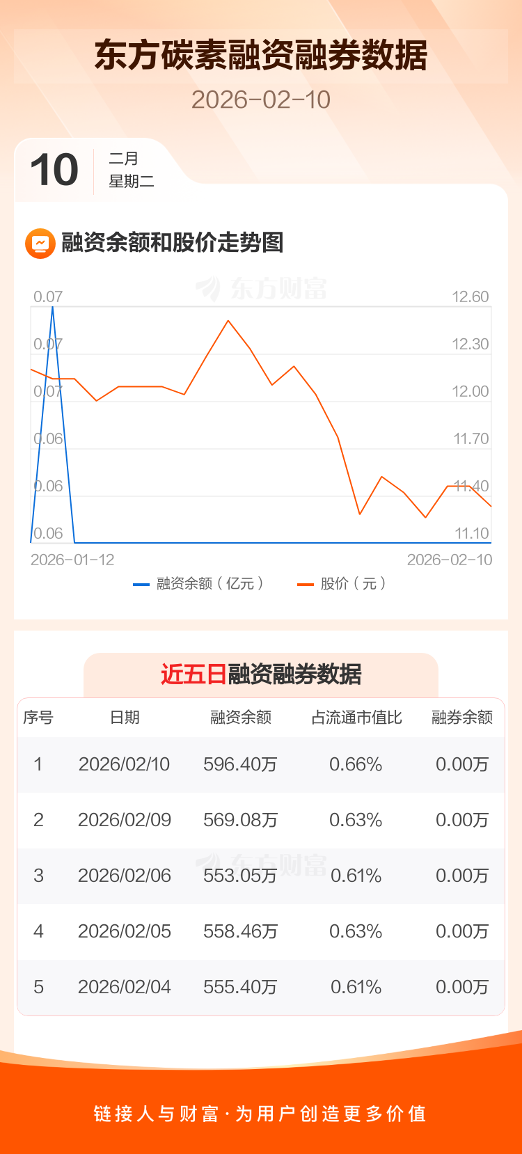 交易所最新数据显示,东方碳素于2026年2月10日获融资买入37.08万元,融资偿还9.76万元,当日融资净买入27.32万元。目前,该股融资余额596.40万,占流通市值比例为0.66%。
