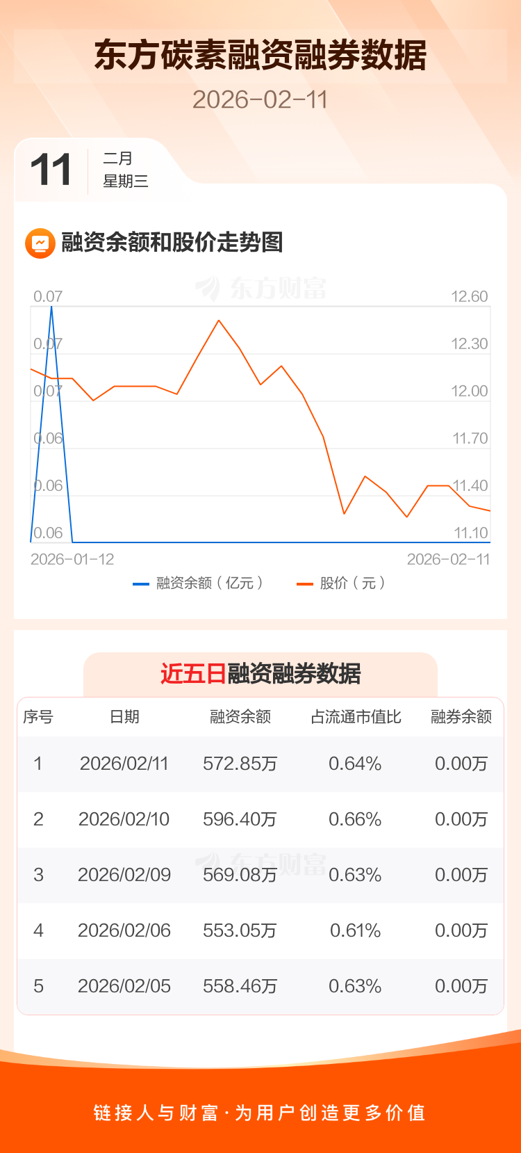 交易所最新数据显示,东方碳素于2026年2月11日获融资买入26.92万元,融资偿还50.47万元,当日融资净偿还23.55万元。目前,该股融资余额572.85万,占流通市值比例为0.64%。