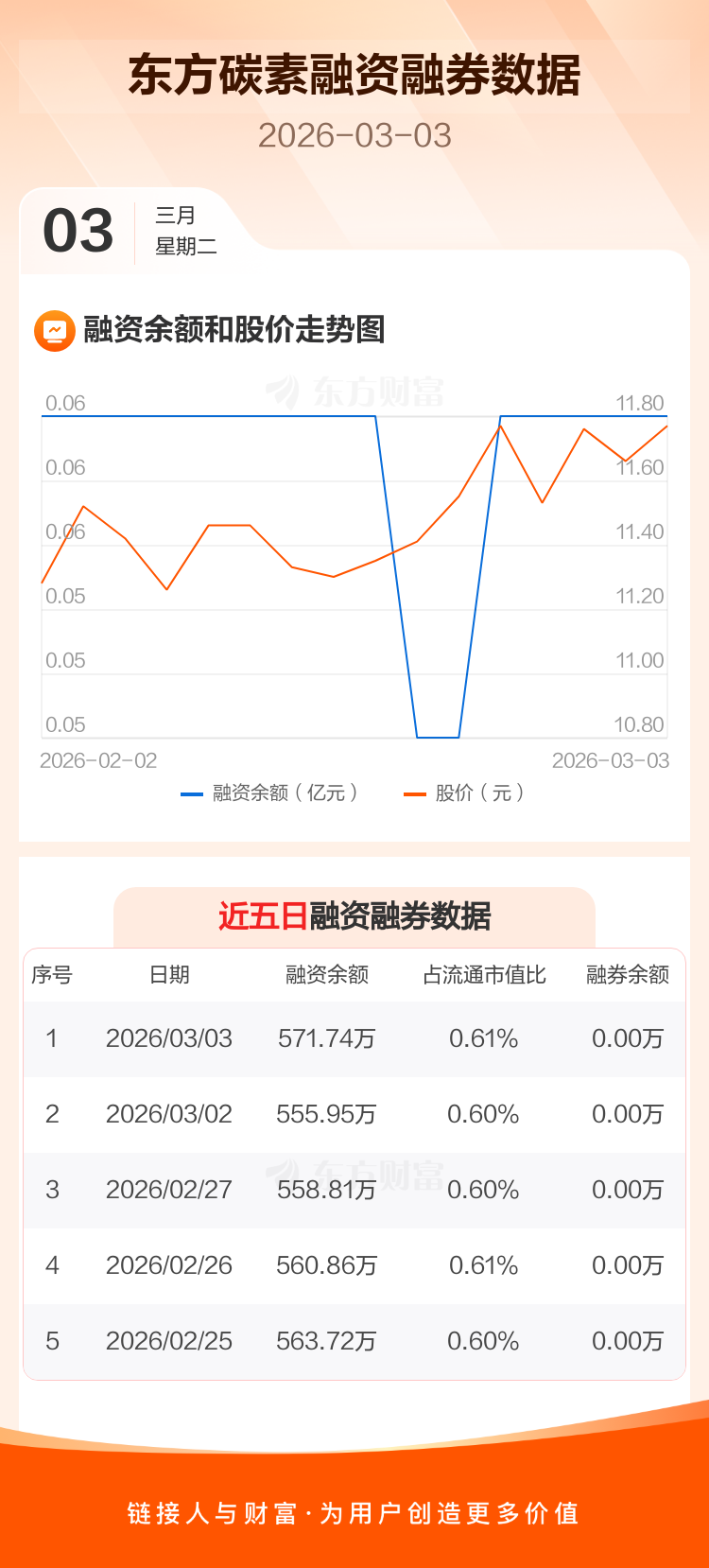 交易所最新数据显示,东方碳素于2026年3月3日获融资买入28.76万元,融资偿还12.97万元,当日融资净买入15.79万元。目前,该股融资余额571.74万,占流通市值比例为0.61%。
