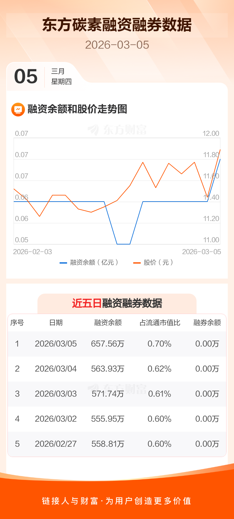 交易所最新数据显示,东方碳素于2026年3月5日获融资买入113.51万元,融资偿还19.88万元,当日融资净买入93.63万元。目前,该股融资余额657.56万,占流通市值比例为0.70%。