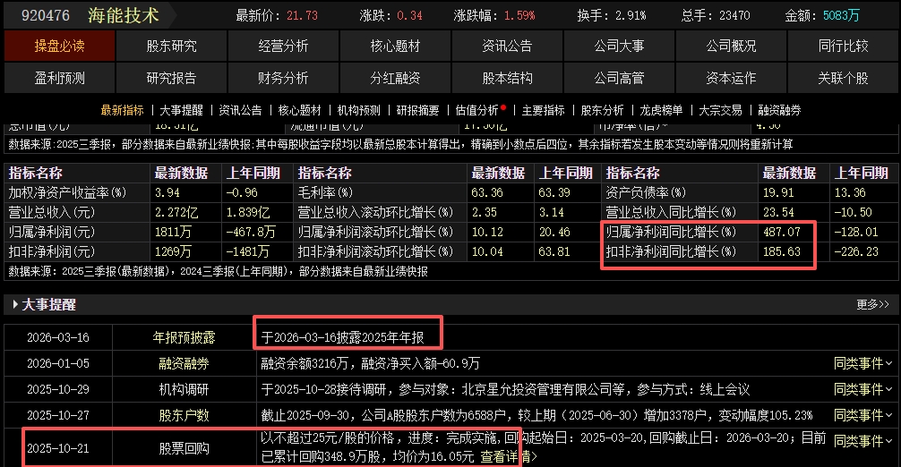 海能技术连续两天翻倍放量!年报前几个披露的业绩增长最好的一只!年报靠前的低位小票或都有想象预期!博迅生物这几天大涨不就说明了嘛!最近的惠而浦、大洋生物、盐湖股份业绩预告出来后都涨停过!它们为业绩大增股打样了!期望30CM的它这几天能来个业绩预告!$海能技术(SZ920476)$ $海希通讯(SZ920405)$ $大鹏工业(SZ920091)$