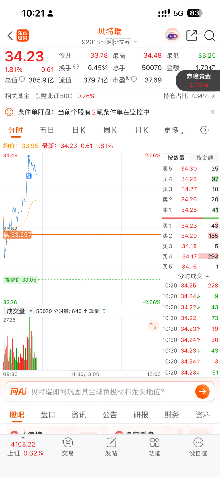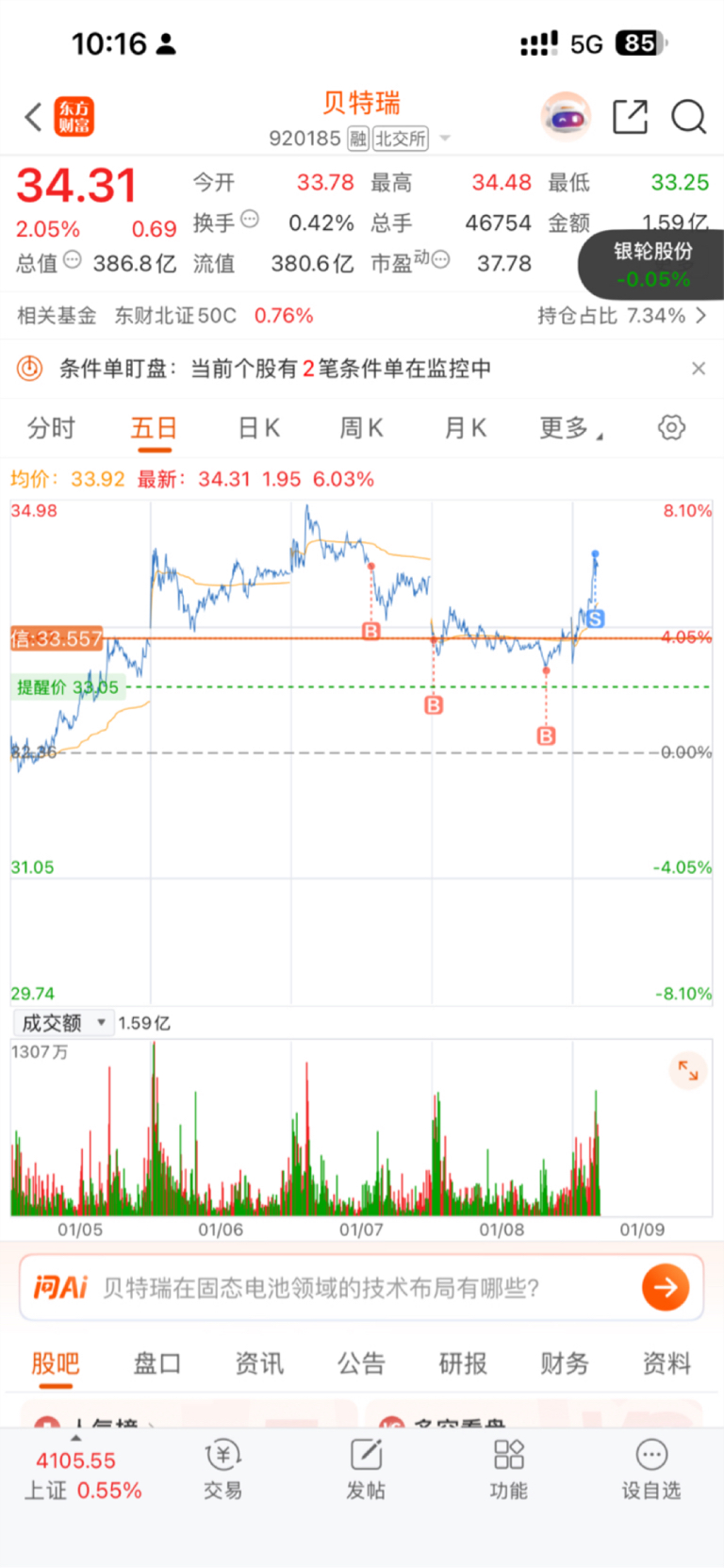 $贝特瑞(SZ920185)$ 先做个隔日T降成本,有机会日内还可以加回
