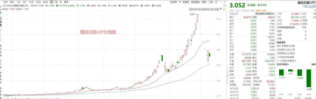 昨天国际白银小幅下跌,国投白银LOF(161226)大跌9%+,又开始套人了。