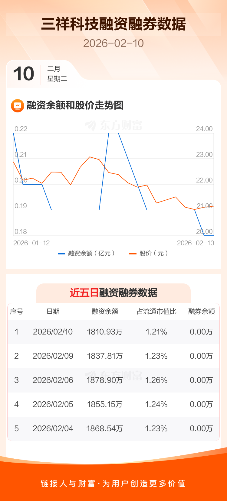 交易所最新数据显示,三祥科技于2026年2月10日获融资买入43.01万元,融资偿还69.89万元,当日融资净偿还26.88万元。目前,该股融资余额1810.93万,占流通市值比例为1.21%。