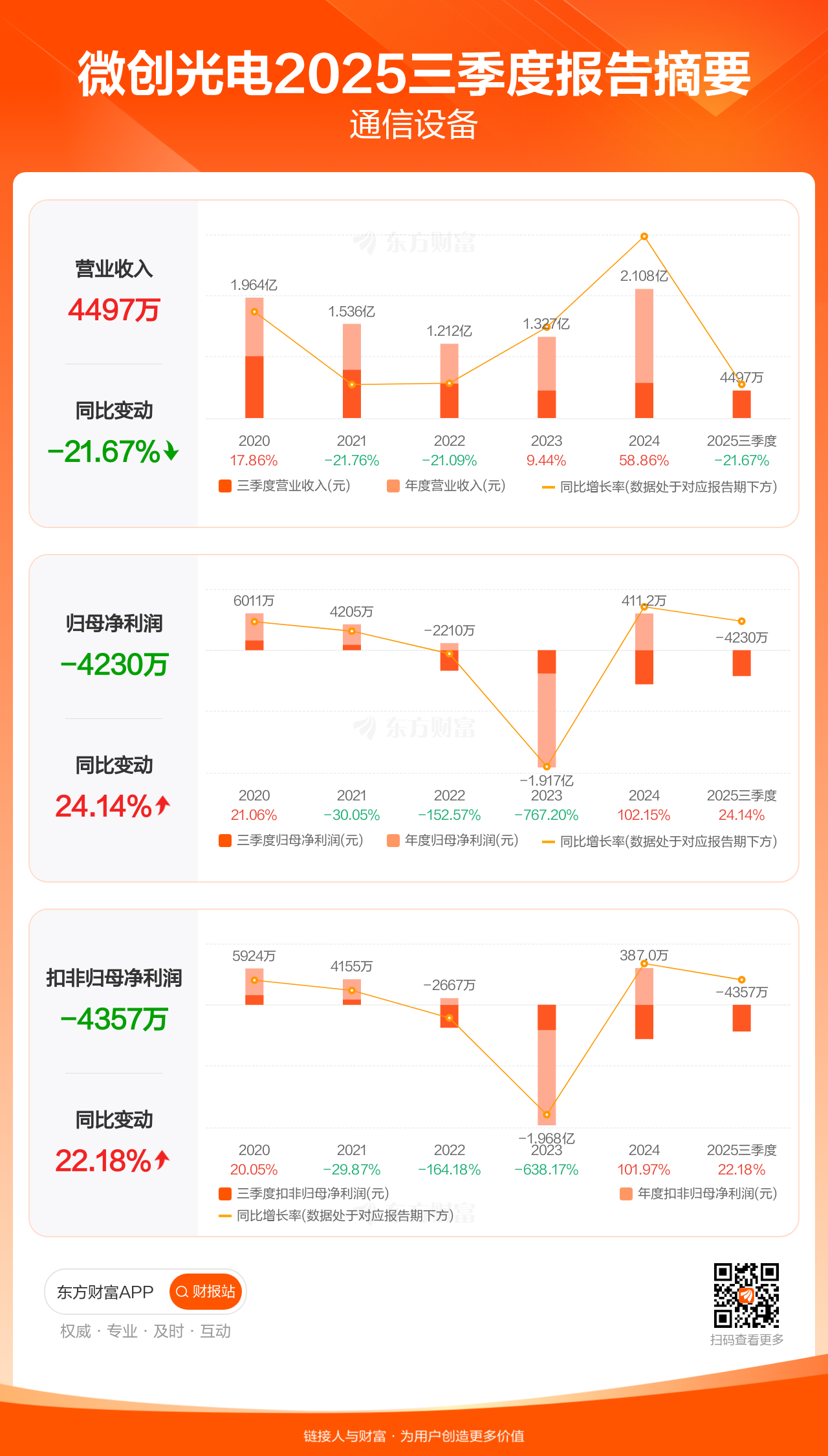 微创光电10月30日发布2025年三季报显示,公司前三季实现营业收入4497.41万元,同比下滑21.67%;归母净利润-4229.94万元;扣非归母净利润-4356.98万元。