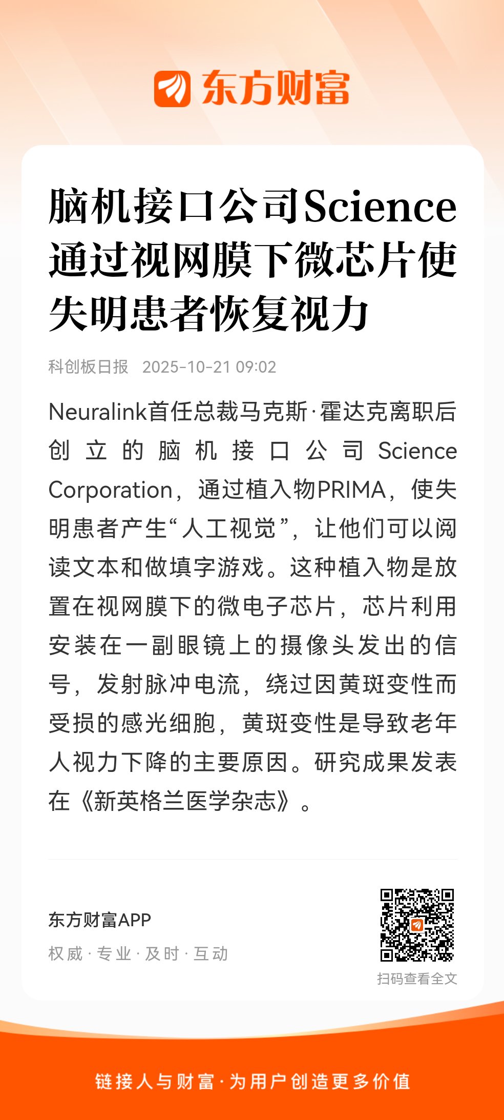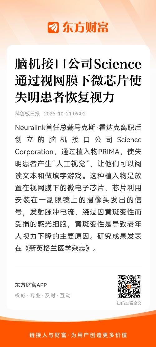 Neuralink首任总裁马克斯·霍达克离职后创立的脑机接口公司Science Corporation,通过植入物PRIMA,使失明患者产生“人工视觉”,让他们可以阅读文本和做填字游戏。这种植入物是放置在视网膜下的微电子芯片,芯片利用安装在一副眼镜上的摄像头发出的信号,发射脉冲电流,绕过因黄斑变性而受损的感光细胞,黄斑变性是导致老年人视力下降的主要原因。研究成果发表在《新英格兰医学杂志》。