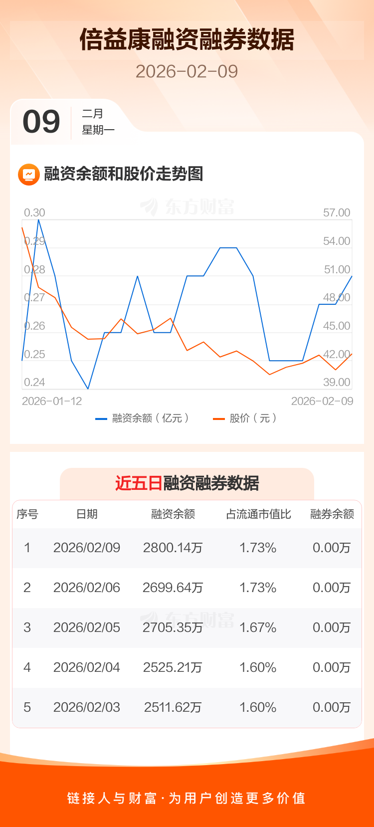 交易所最新数据显示,倍益康于2026年2月9日获融资买入525.07万元,融资偿还424.57万元,当日融资净买入100.5万元。目前,该股融资余额2800.14万,占流通市值比例为1.73%。