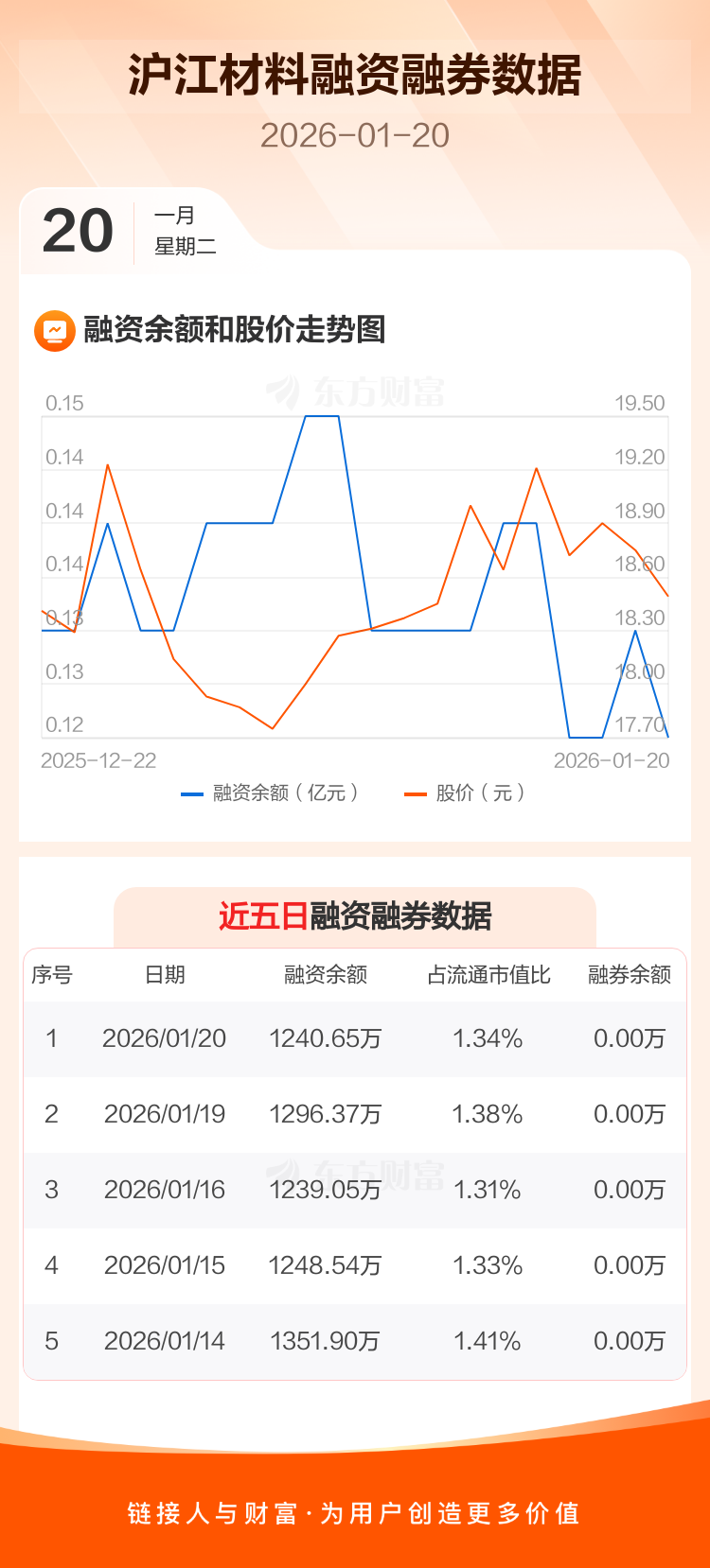 交易所最新数据显示,沪江材料于2026年1月20日获融资买入56.97万元,融资偿还112.69万元,当日融资净偿还55.72万元。目前,该股融资余额1240.65万,占流通市值比例为1.34%。