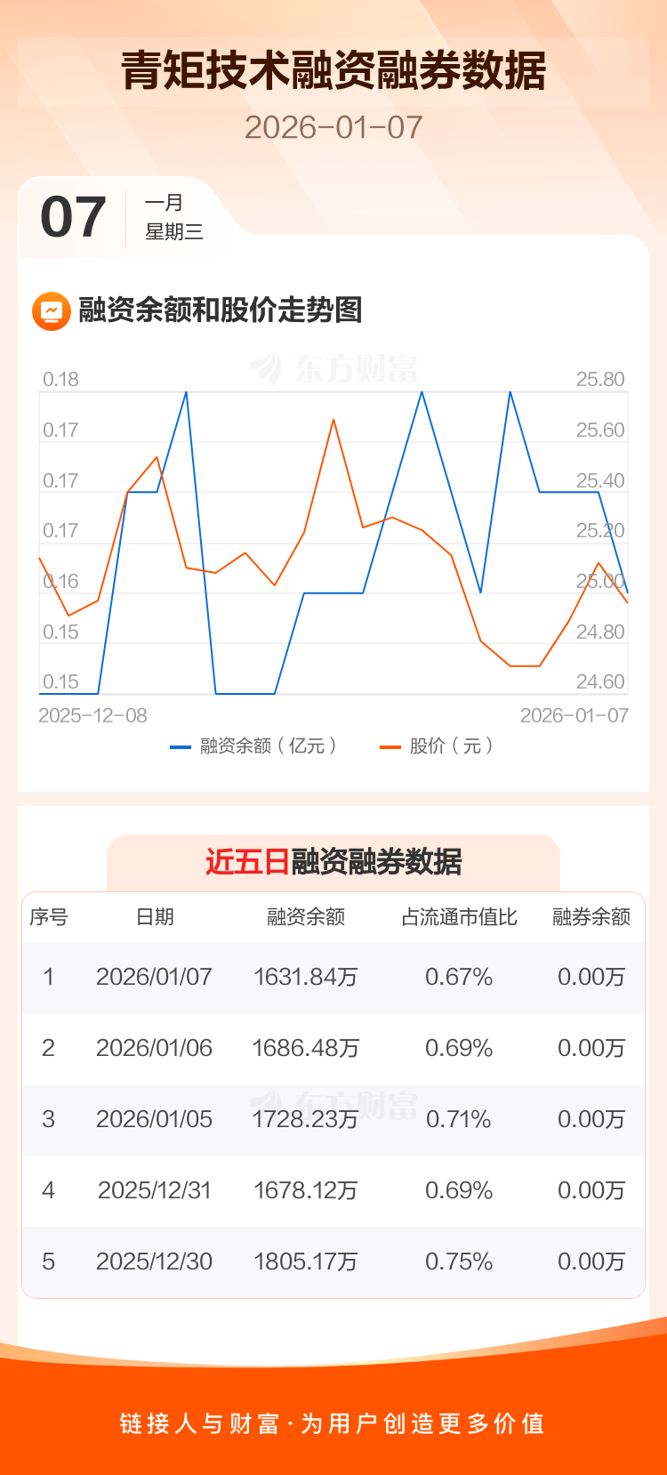 交易所最新数据显示,青矩技术于2026年1月7日获融资买入42.35万元,融资偿还97.00万元,当日融资净偿还54.64万元。目前,该股融资余额1631.84万,占流通市值比例为0.67%。