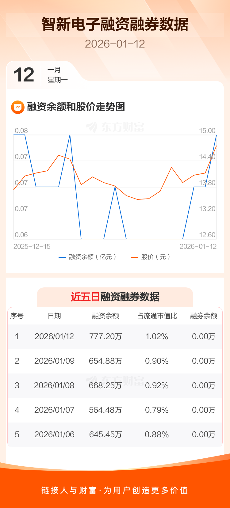 交易所最新数据显示,智新电子于2026年1月12日获融资买入253.20万元,融资偿还130.88万元,当日融资净买入122.32万元。目前,该股融资余额777.20万,占流通市值比例为1.02%。