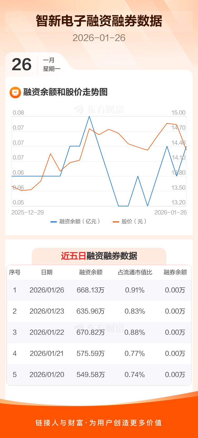 交易所最新数据显示,智新电子于2026年1月26日获融资买入104.18万元,融资偿还72.01万元,当日融资净买入32.17万元。目前,该股融资余额668.13万,占流通市值比例为0.91%。